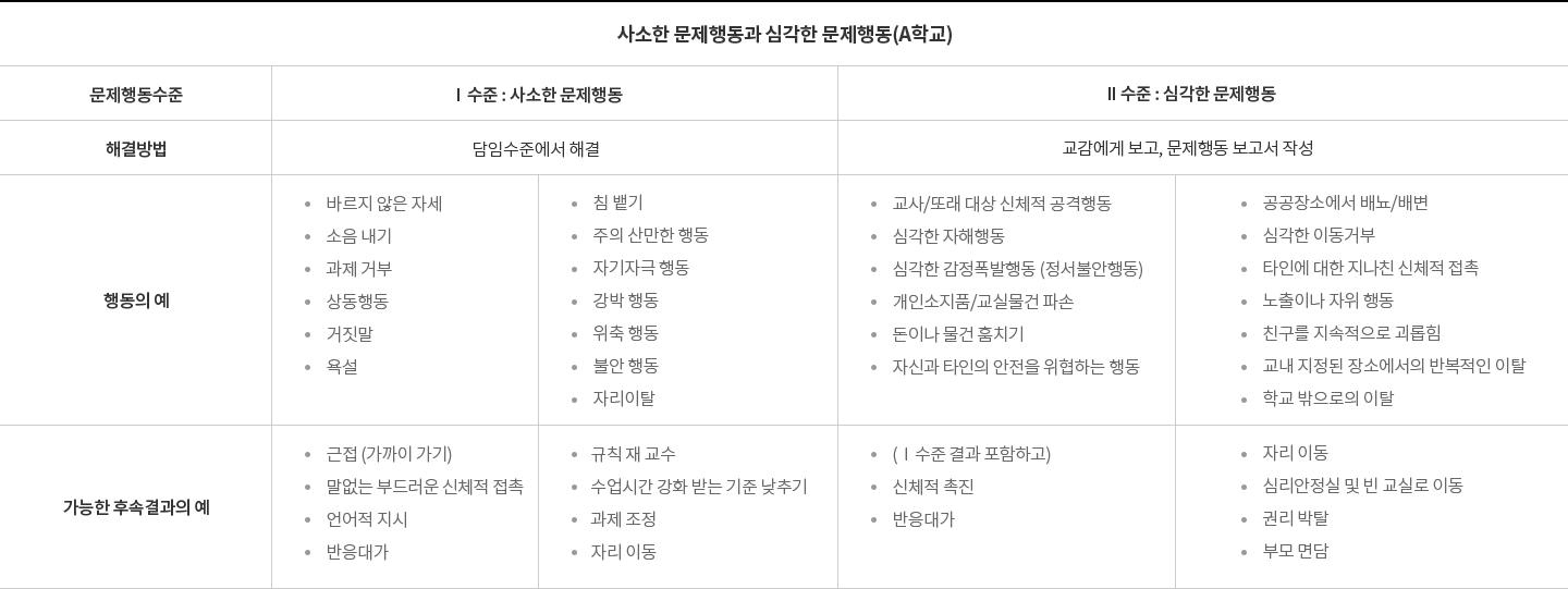 수준별 문제행동에 따른 교정전략 및 후속조치